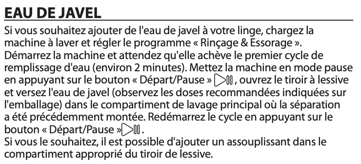 Lisez le chapitre EAU DE JAVEL dans le mode d'emploi de la notice