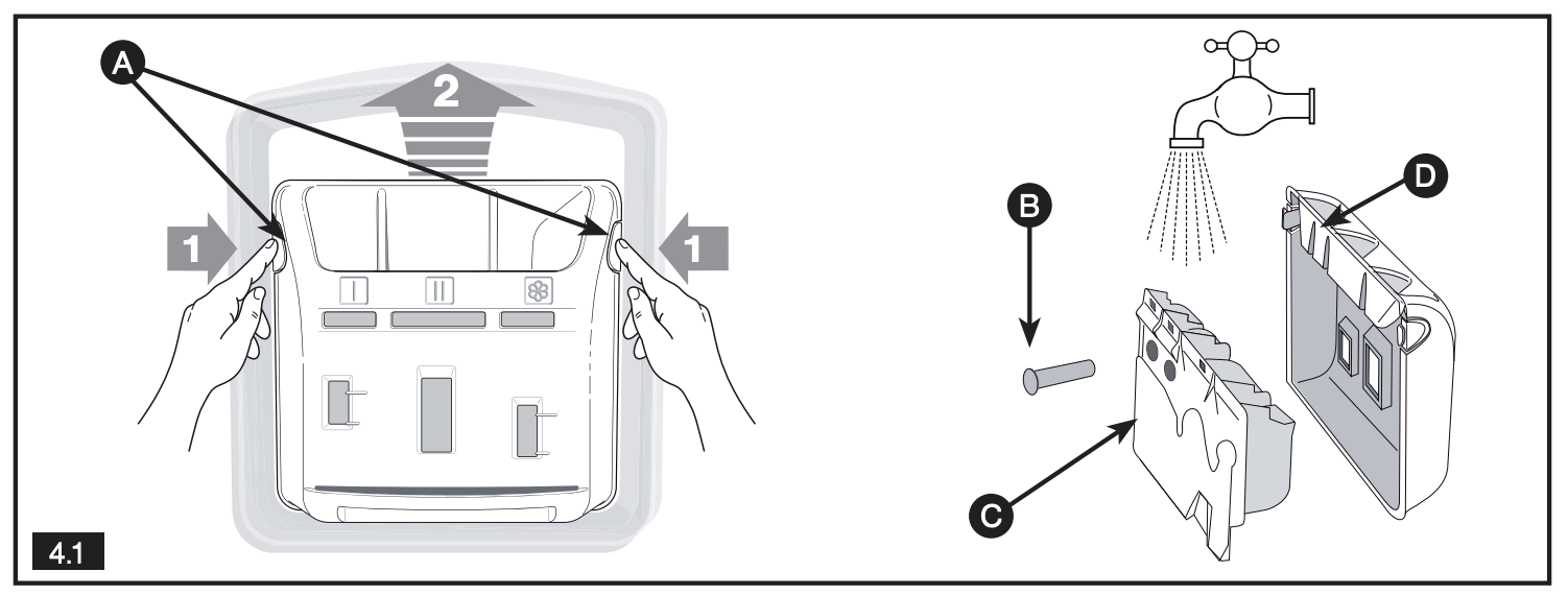 — Déverrouillez la boîte en appuyant sur les bossages, A tirez la vers vous. Retirez le siphon B, séparez la boîte C de l’enjoliveur D . — Rincez le tout sous le robinet. — Remontez tout les éléments de la boîte, puis remettez l’ensemble à sa place sous le couvercle de la machine.