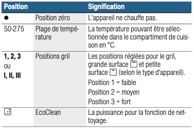 Le sélecteur de température vous permet de régler la température du compartiment de cuisson. Par ailleurs, vous pouvez sélectionner les puissances pour d'autres fonctions.
