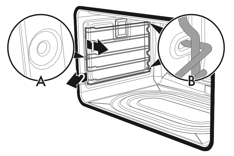 • Tirez la structure vers l’intérieur du four de manière à la décrocher de l’encastrement A, puis extrayez-la des logements situés à l’arrière B. Le panneau autonettoyant latéral est accroché à la structure de support des grilles/lèchefrites.