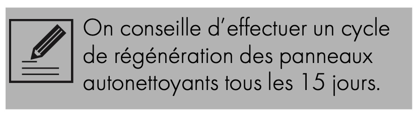 Le cycle de régénération des panneaux autonettoyants est une méthode pour le nettoyage avec réchauffage indiquée pour éliminer des petits résidus de nature grasse et non sucrée.