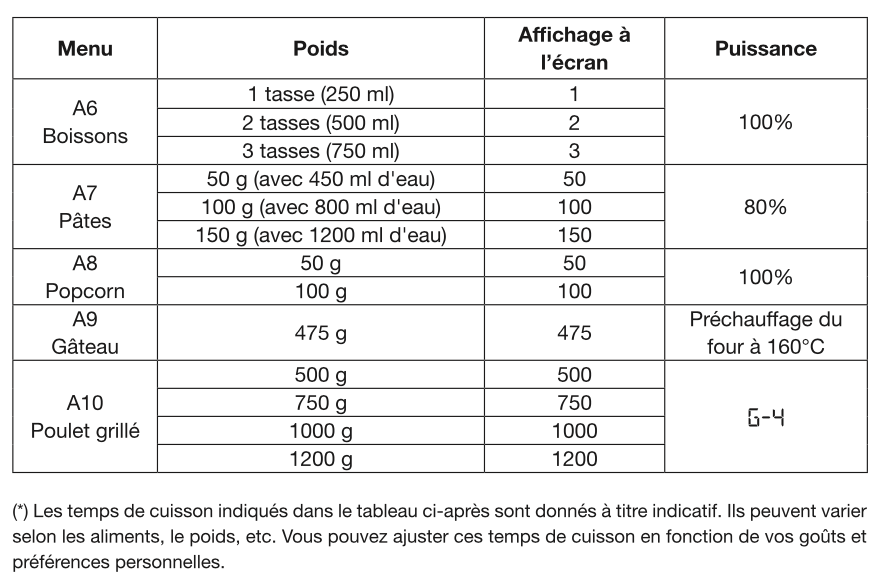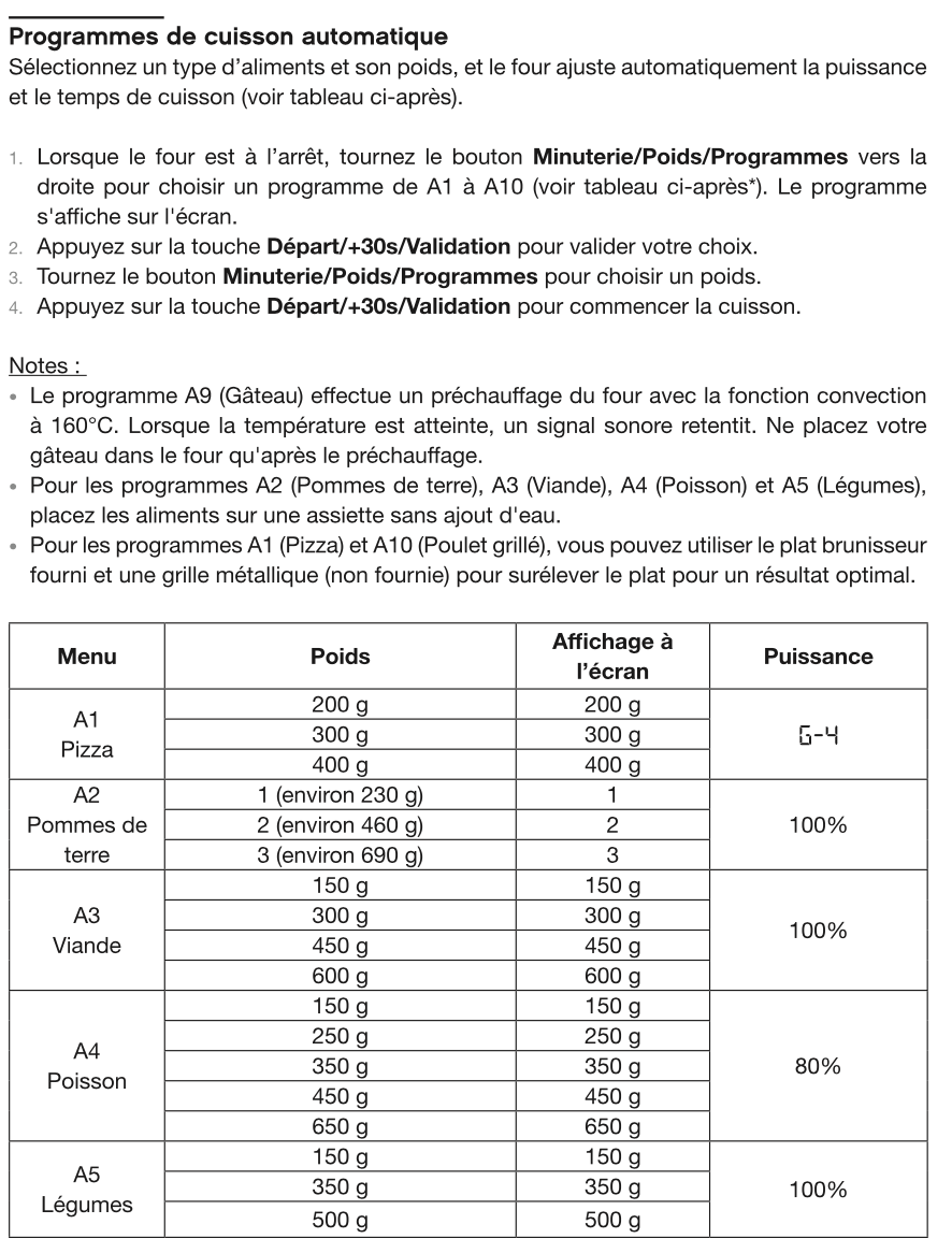 Essentiel EX305M : Quels sont les programmes de cuisson automatique ?