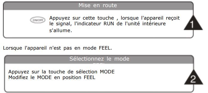 Le mode FEEL (mode SENTIR) s'enclenche lorsque vous avez sélectionné automatiquement le mode de fonctionnement (HEATING, DRY, FAN, COOLING) en fonction de la température qui règne dans la pièce au démarrage.