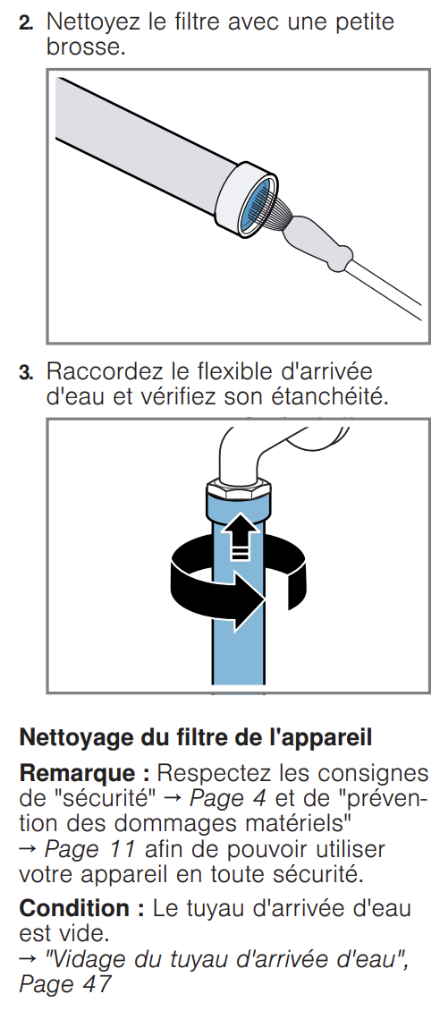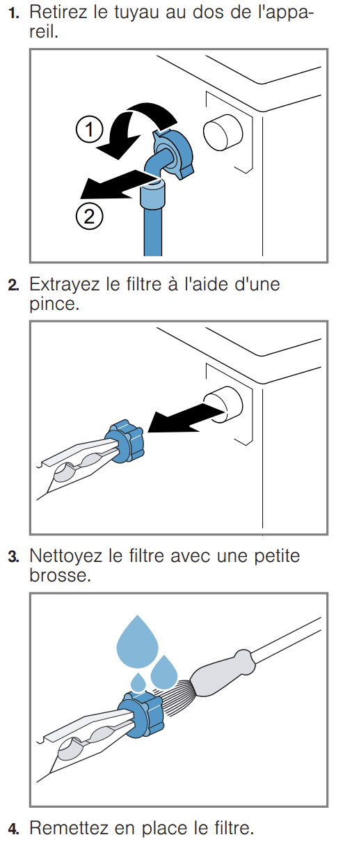 Bosch WAN28219FF : Comment nettoyer les filtres d'arrivée d'eau ?