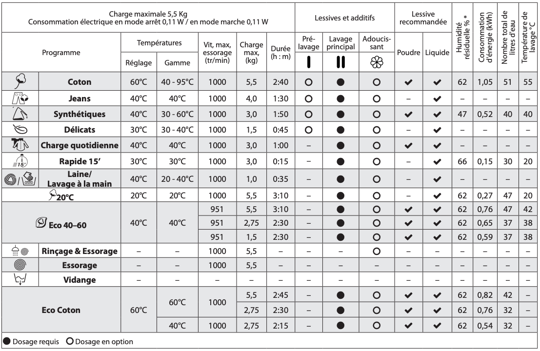 Cycle de lavage long pour les cotons : réglez le cycle de lavage Coton avec une température de 40°C. Programme synthétique : réglez le cycle de lavage Synthétiques avec une température de 40°C. Ces données peuvent différer à la maison du fait d'un changement de conditions de la température de l'eau en entrée, de la pression d'eau, etc. Les valeurs de durée de programme approximatives se réfèrent à des réglages par défaut des programmes, sans options. Les valeurs indiquées pour les programmes autres que le programme Eco 40-60 sont fournies à titre indicatif uniquement.