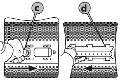 Débranchez le lave-linge. Enlevez le linge du tambour. Fermez les volets du tambour et tournez le tambour d’un demi-tour (photo a). En utilisant un tournevis, appuyez sur l’extrémité en plastique, tout en coulissant le chariot de gauche à droite (photo b, c) à la main et il tombera dans le tambour. Ouvrez le tambour. Vous pouvez récupérer l’objet à travers le trou dans le tambour. Réinstallez la lame de l’intérieur du tambour : Positionnez la pointe en plastique au-dessus du trou sur le côté droit du tambour (photo d). Ensuite, coulissez la lame en plastique de droite à gauche jusqu’à ce qu’elle s’enclenche. Refermez les volets du tambour, tournez le tambour d’un demi-tour et vérifiez le positionnement de la lame au niveau de tous ses points d’ancrage. Rebranchez le lave-linge.