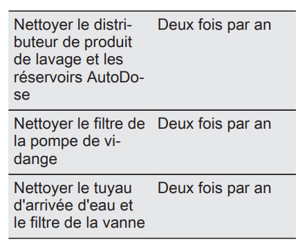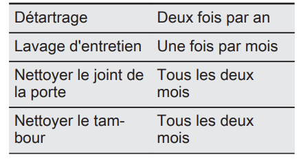 Le nettoyage périodique permet de prolonger la durée de vie de votre appareil. Après chaque cycle, maintenez la porte et le distributeur de détergent légèrement entrouverts pour permettre la circulation de l’air et éliminer l’humidité à l’intérieur de l’appareil : cela empêchera l’apparition de moisissure et d’odeurs. Si l’appareil n’est pas utilisé pendant une durée prolongée : fermez le robinet d’eau et débranchez l’appareil. Calendrier indicatif de nettoyage périodique :