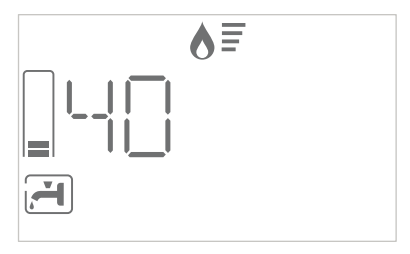 Il est possible d’ajuster la température de l’eau sanitaire grâce au bouton de réglage (2) entre 36 et 60°C. La valeur de la consigne sélectionnée clignote quelques secondes puis reste indiquée sur l’ecran pendant un puisage. Dans l’exemple ci-dessous, température eau sanitaire : 40°C puisage en cours.