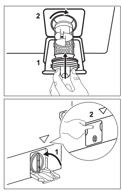 9. Replacez le filtre dans les guides spéciaux en le tournant vers la droite. Assurez-vous de serrer correctement le filtre afin d'empêcher toute fuite.