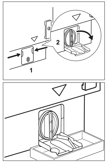 2. Placez un récipient sous le logement de la pompe de vidange pour recueillir l'eau qui s'écoule. Gardez toujours un chiffon à portée de main pour essuyer l'eau qui peut s'écouler lorsque vous retirez le filtre.