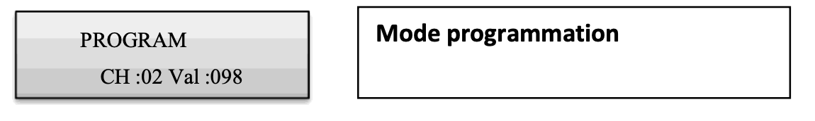 - Dès qu'un fader est déplacé, l'écran indique le numéro du canal de contrôle dans la ligne inférieure et la valeur de sortie actuelle en tant que valeur DMX.