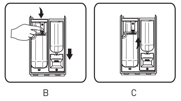 1. Poussez le levier de déverrouillage situé dans le compartiment de lavage principal vers le bas et retirez le bac (fig. « B »).