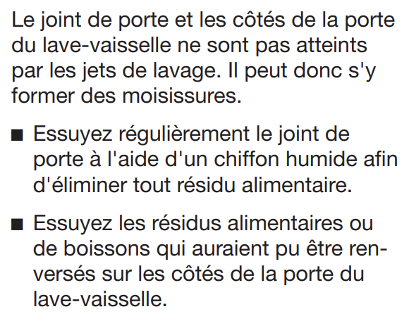 Lisez le chapitre Nettoyage du joint de porte et de la porte dans entretien et dépannage de la notice