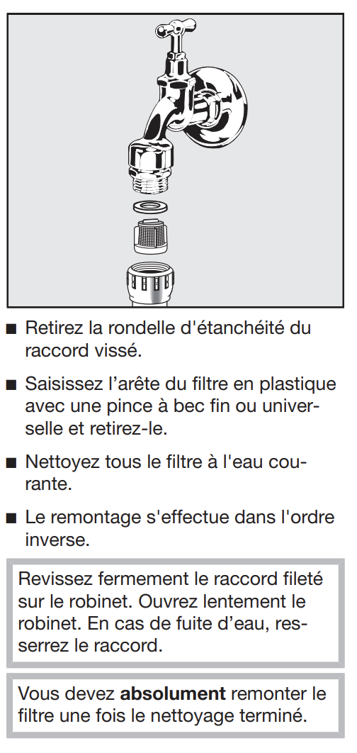 Lisez le chapitre Nettoyage du filtre d'arrivée d'eau dans entretien et dépannage de la notice