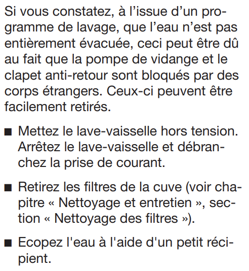 Lisez le chapitre Nettoyage de la pompe de vidange dans entretien et dépannage de la notice