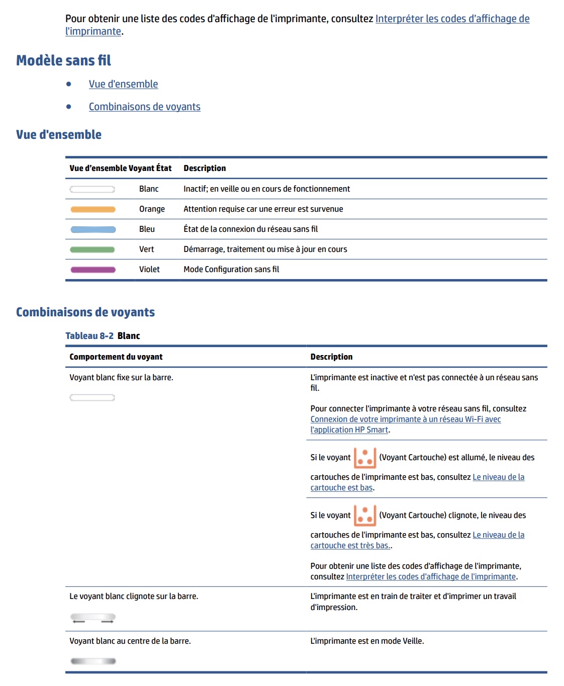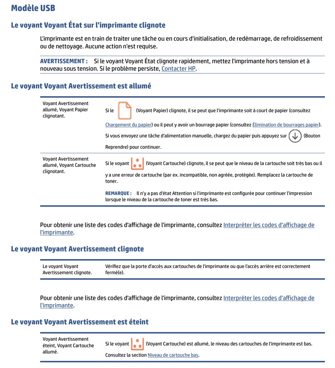 Lisez le chapitre Interprétation de l'état des voyants du panneau de commande dans entretien et dépannage de la notice