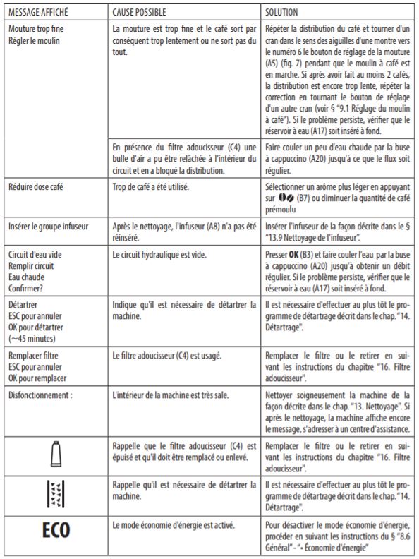 Notice Delonghi DINAMICA FEB3535.SB MESSAGES AFFICHÉS À L'ÉCRAN