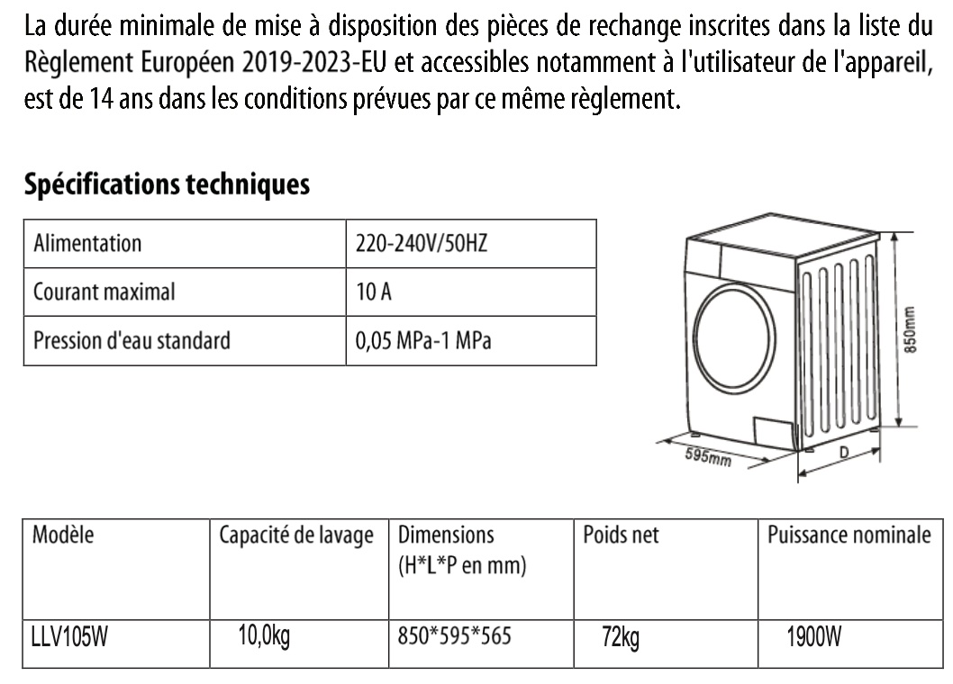 Lave-linge Hublot 10 Kg - Moteur Induction - 1500 Tours/min - Blanc - Llv105w . Rapprochez votre smartphone équipé de la technologie NFC et lisez directement le chapitre Disponibilité des pièces détachées dans Entretien et dépannage