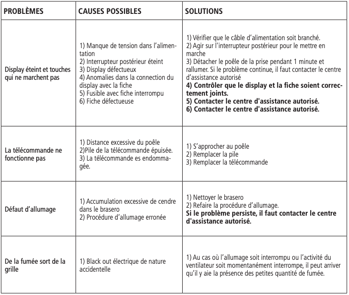 Les inconvénients principales pourraient être résolus en lisant le tableau de suite. Si après avoir fait ce qui est ici décrit, le problème n’a pas été résoulu, il faut interpeller le service d’assistance..