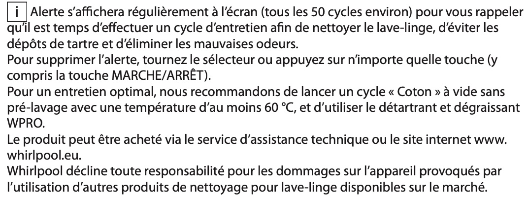Notice Whirlpool W6W045WBPFR PROCÉDURE DE NETTOYAGE ET DE DÉTARTRAGE