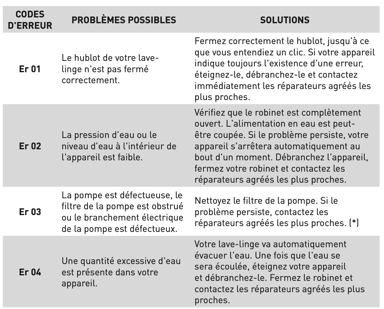 Notice Valberg WF 612 D S701T Messages d'erreur automatiques et solutions