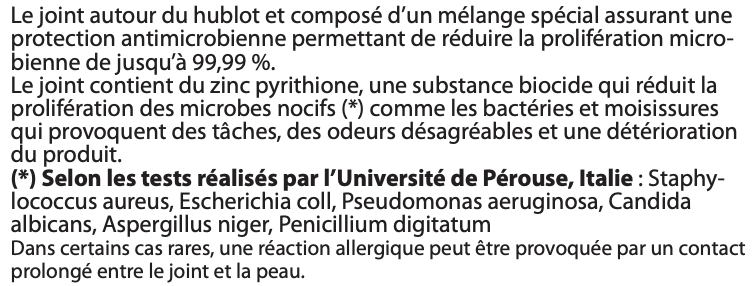 Lisez le chapitre JOINT ANTIMICROBIEN dans entretien et dépannage de la notice