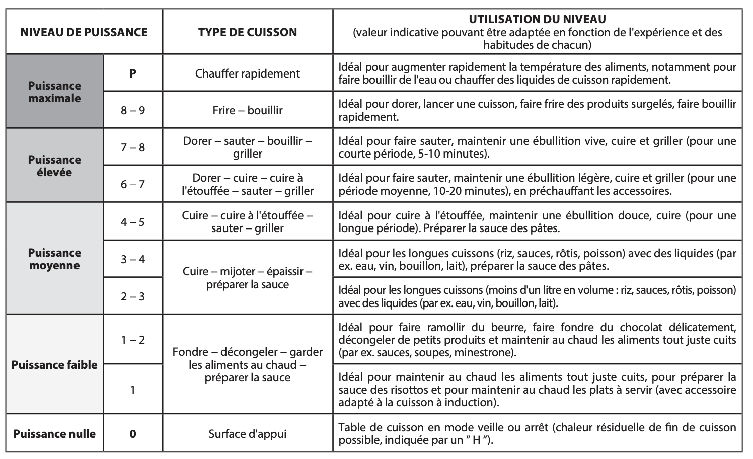 Lisez le chapitre Tableau de cuisson dans le mode d'emploi de la notice