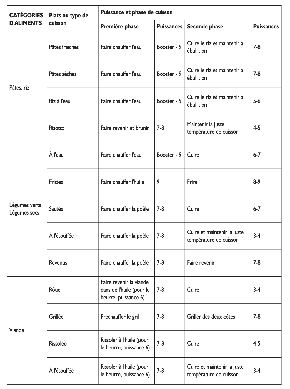 Lisez le chapitre Tableau de cuisson dans le mode d'emploi de la notice