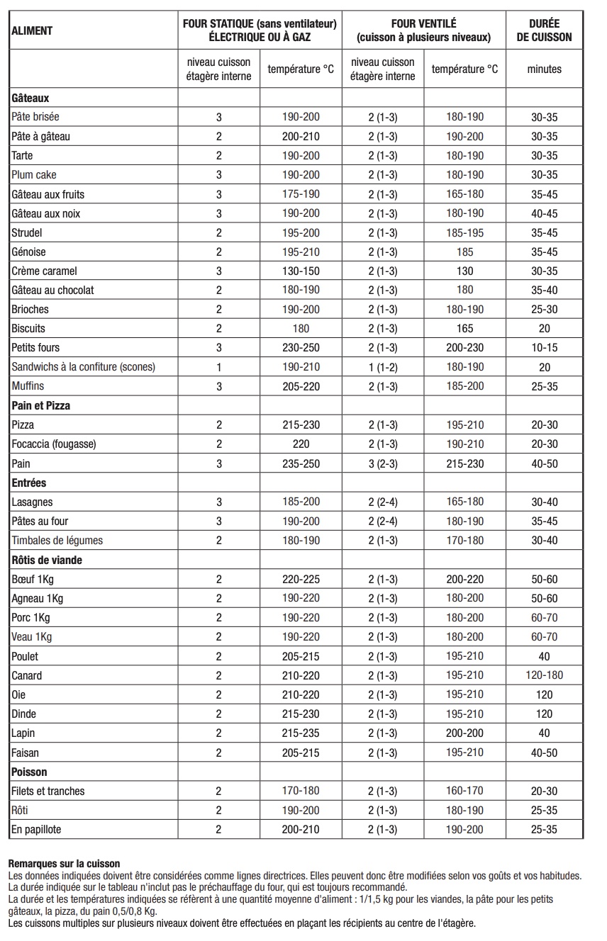 Lisez le chapitre TABLEAU DE CUISSON dans le mode d'emploi de la notice