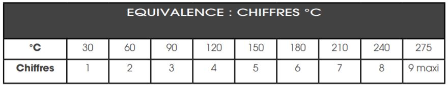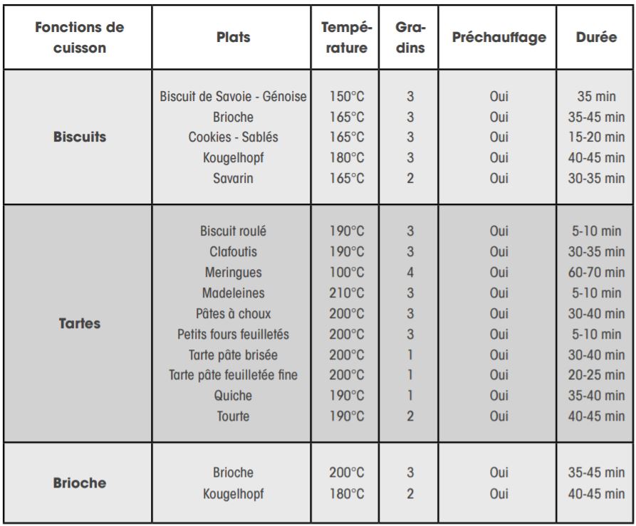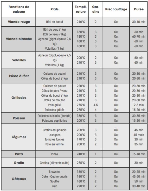 Lisez le chapitre TABLEAU DE CUISSON dans le mode d'emploi de la notice