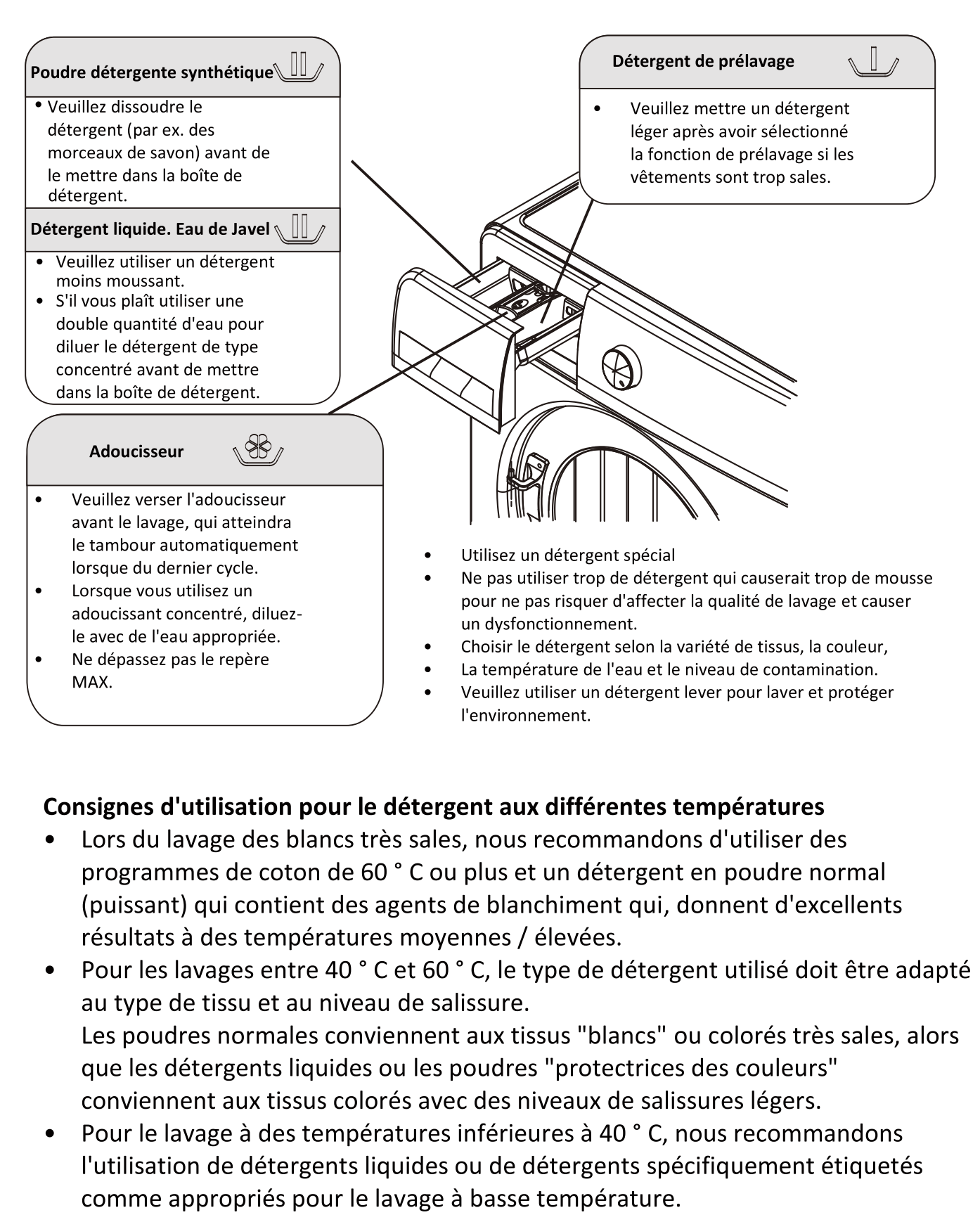 Lisez le chapitre Méthode d'utilisation de la boîte de détergent dans le mode d'emploi de la notice