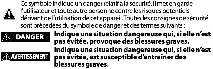 Tous les messages relatifs à la sécurité spécifient le danger potentiel auquel ils se réfèrent et indiquent comment réduire le risque de lésions, de dommages et de décharges électriques résultant d’une utilisation non réglementaire de l’appareil. Veuillez observer scrupuleusement les instructions suivantes :