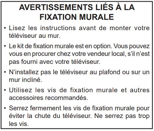 • TOUJOURS utiliser les armoires ou les supports ou les méthodes de montage recommandées par le fabricant du téléviseur.