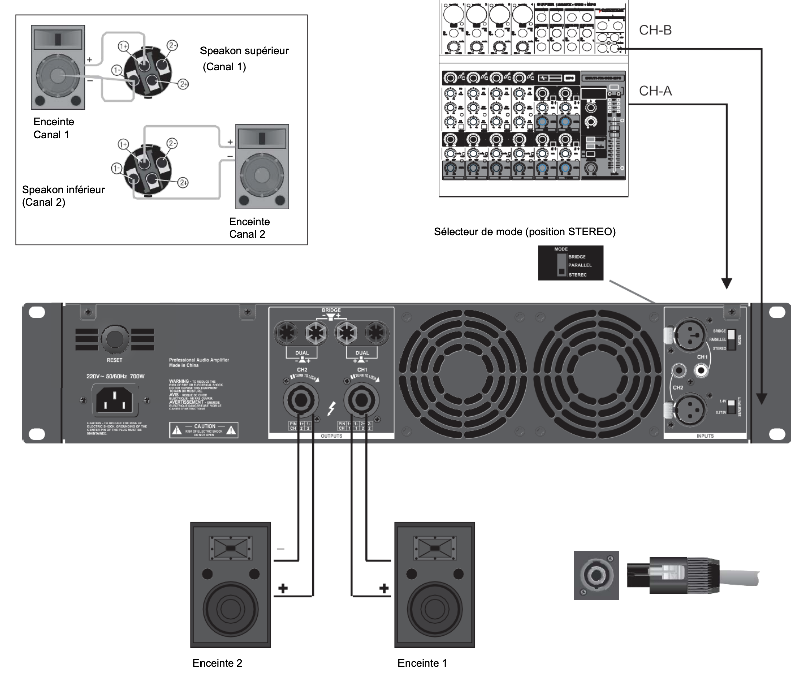 Connexion canal 1 sur l’anode (noir) vers l’amplificateur de puissance Speakon enceinte 1-canal 2, la connexion et le canal 1 est la même.