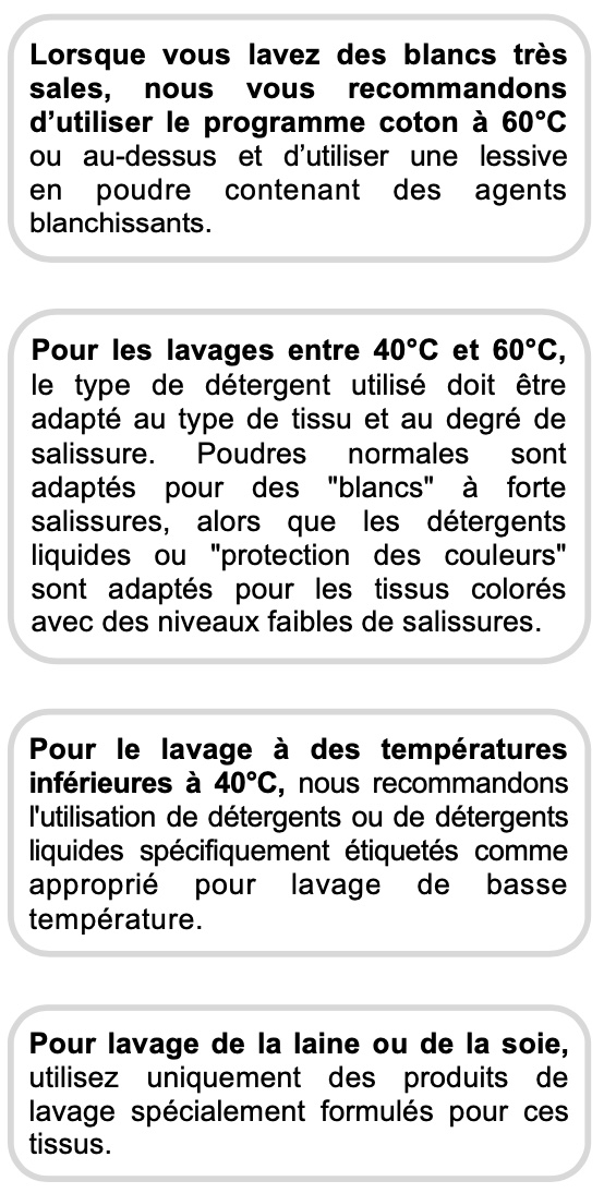 Voici un mini guide avec des conseils et des recommandations sur l'utilisation des détergents aux différentes températures. Dans tous les cas, toujours lire les instructions sur le détergent à utiliser et les doses recommandées.