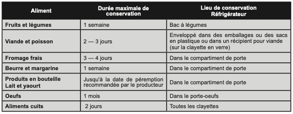 - Les aliments doivent être placés au réfrigérateur dans des récipients fermés ou couverts pour éviter l’humidité et les odeurs.