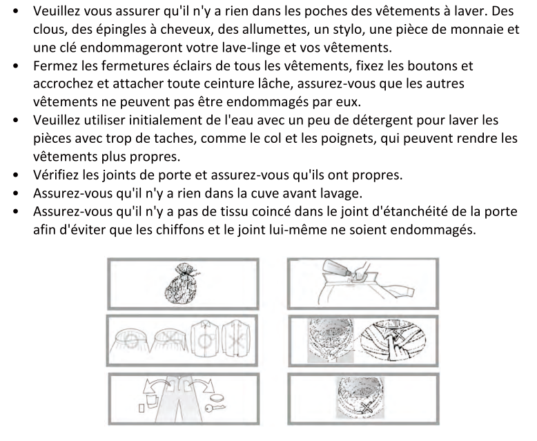 Lisez le chapitre Avertissement avant lavage dans le mode d'emploi de la notice