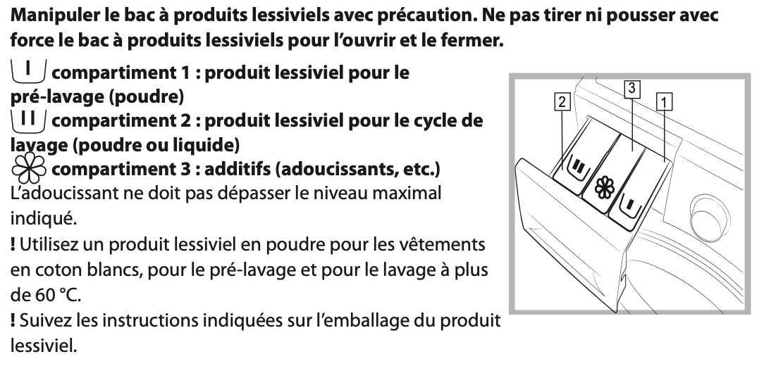 Lisez le chapitre BAC À PRODUITS LESSIVIELS dans le mode d'emploi de la notice