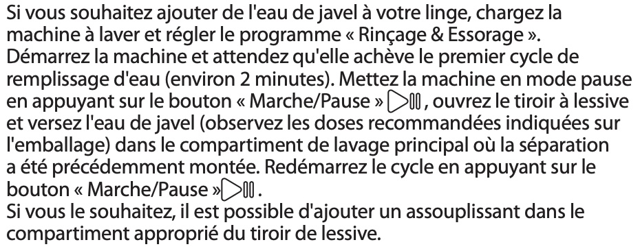 Lisez le chapitre EAU DE JAVEL dans le mode d'emploi de la notice