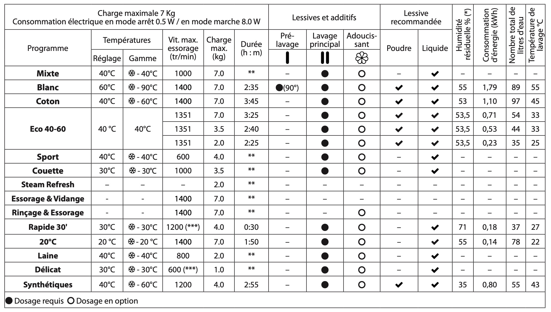 Notice Whirlpool FFB7458BVFR : Section TABLEAU DES PROGRAMMES
