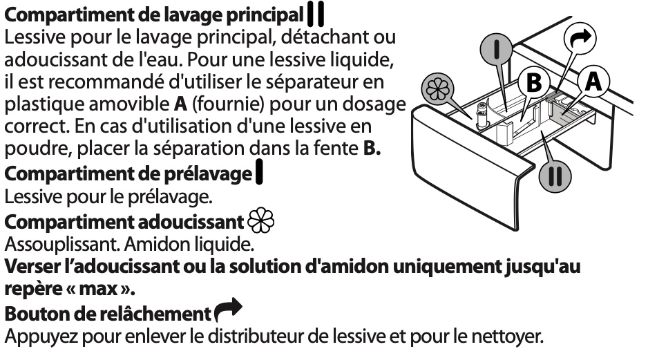 Lisez le chapitre DISTRIBUTEUR DE LESSIVE dans le mode d'emploi de la notice