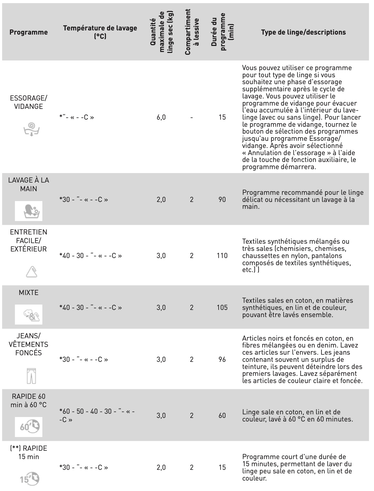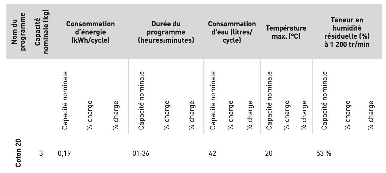 • Les programmes les plus économes en termes de consommation d’énergie sont généralement ceux qui fonctionnent à des températures plus basses et pendant une plus longue durée.