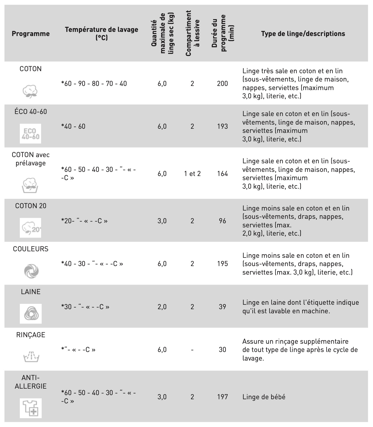 (*) Température de l'eau de lavage du programme réglée par défaut en usine.
