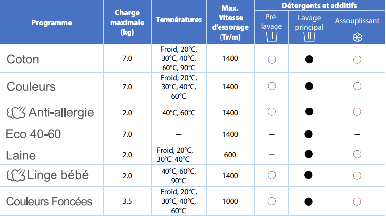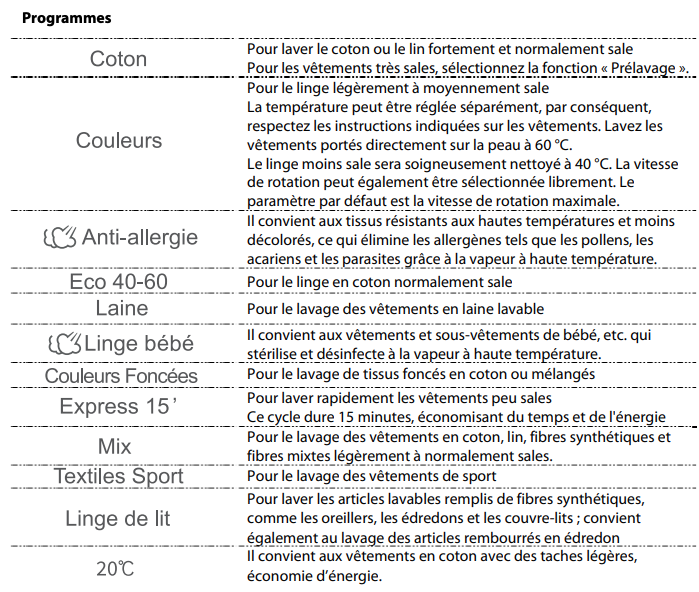 sont adaptés à la stérilisation des vêtements colorés. Lorsque vous voyez la vitre de la porte avec de la vapeur d'eau, ne mettez pas vos mains sur la vitre de la porte et n'ouvrez pas le tiroir à détergent pour éviter les brûlures.