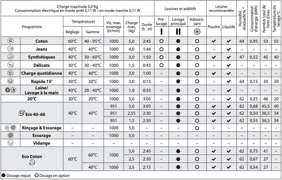 Cycle de lavage long pour les cotons : réglez le cycle de lavage Coton avec une température de 40°C. Programme synthétique : réglez le cycle de lavage Synthétiques avec une température de 40°C.