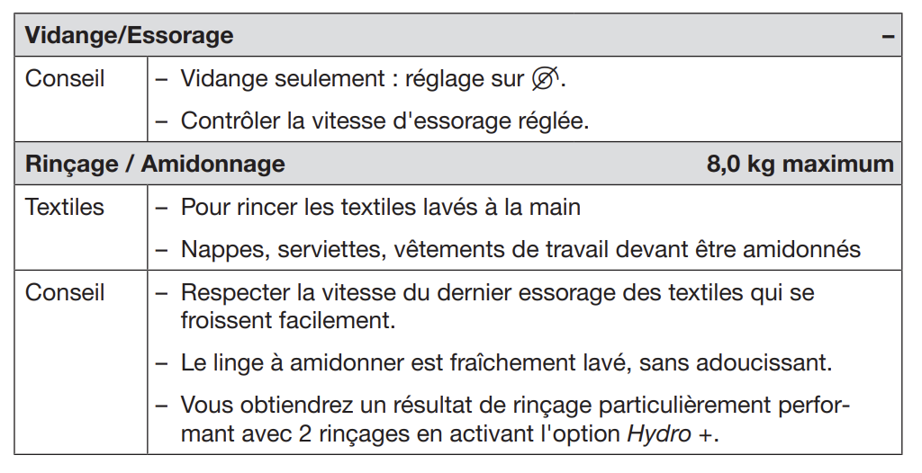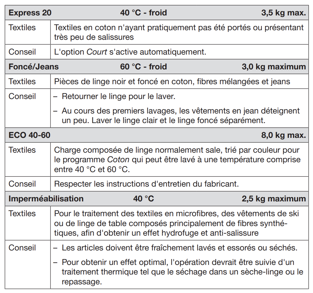 Notice Miele WWD020 : Section Tableau des programmes