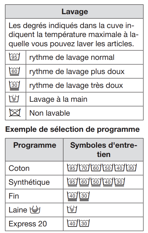 Lisez le chapitre Symboles d'entretien dans le mode d'emploi de la notice