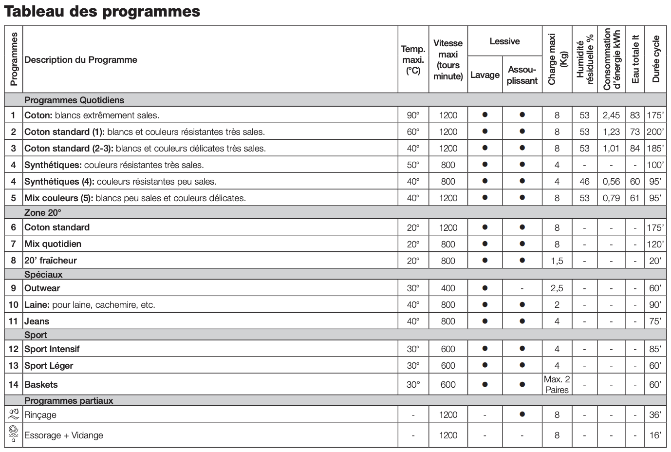 Les programmes 20° (Zone 20°) offrent de bonnes performances de lavage aux basses températures avec une consommation d’électricité réduite qui permet de faire des économies tout en respectant l’environnement. Les programmes 20° satisfont toutes les exigences:
