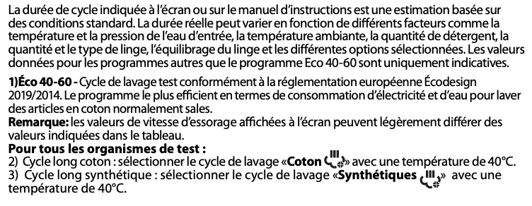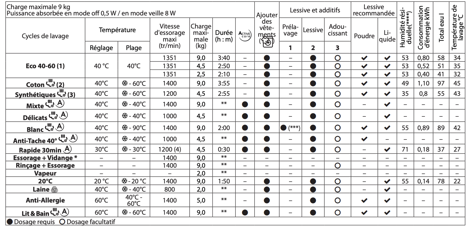 Lisez le chapitre TABLEAU DES CYCLES DE LAVAGE dans le mode d'emploi de la notice