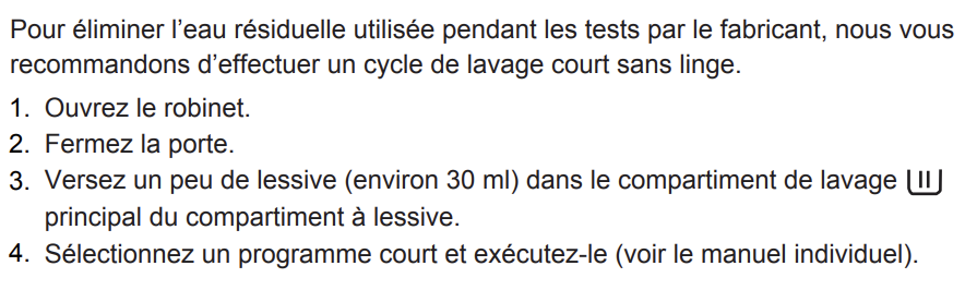 Lisez le chapitre AVANT LE PREMIER CYCLE DE LAVAGE dans le mode d'emploi de la notice